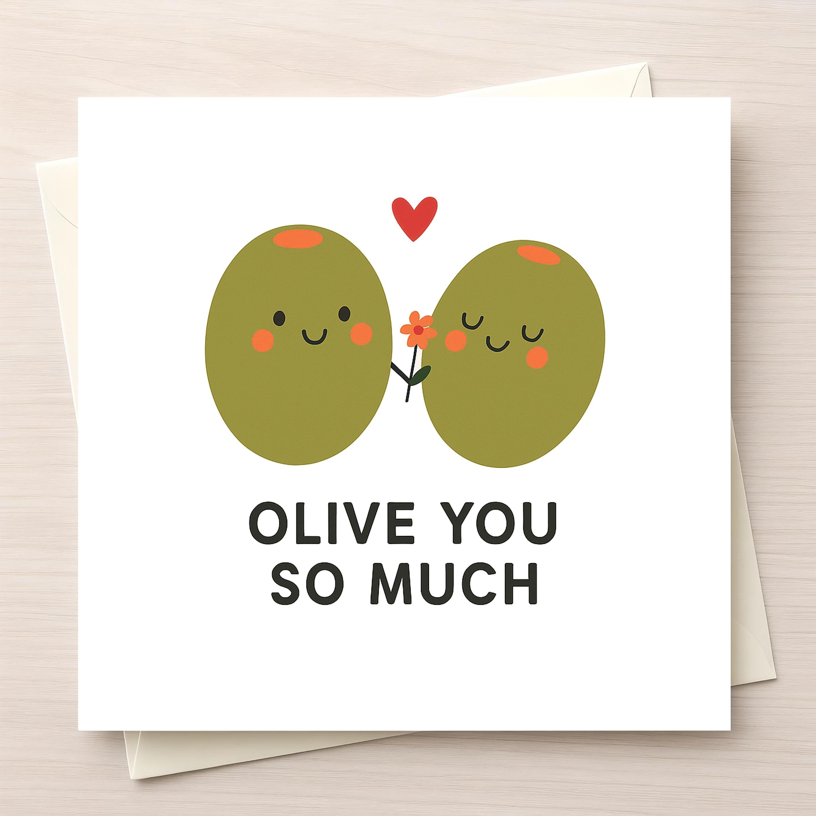 Funny Love Card Olive You So Much | Cute Pun Anniversary or Valentines Card | Printable Kawaii Food Greeting for Her or Him