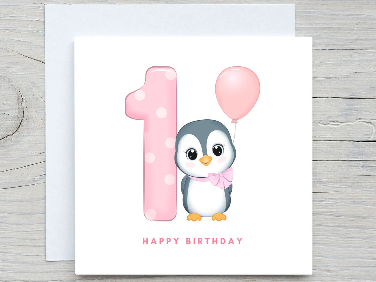 Frist Birthday CARD, Cute birthday card, Penguin 1st birthday card, baby girl birthday, for niece, for granddaughter