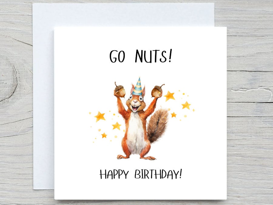 Funny Birthday Card, go nuts, its your birthday card, for him, for her, happy birthday card, Squirrel card, custom birthday card