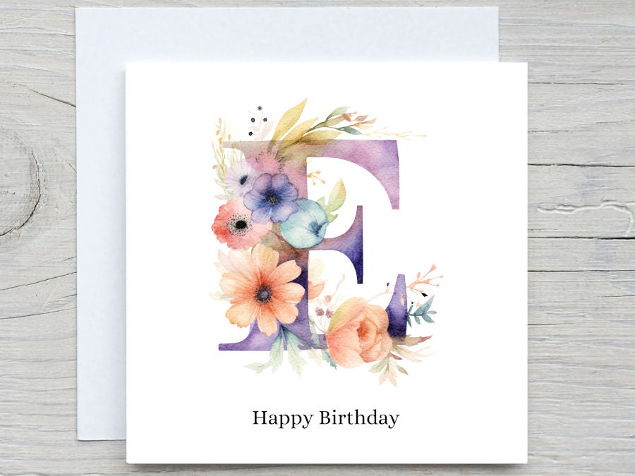 Initials Card, Floral Alphabet Card, Custom card, Letter E Card, Personalised Birthday gift, Floral E card