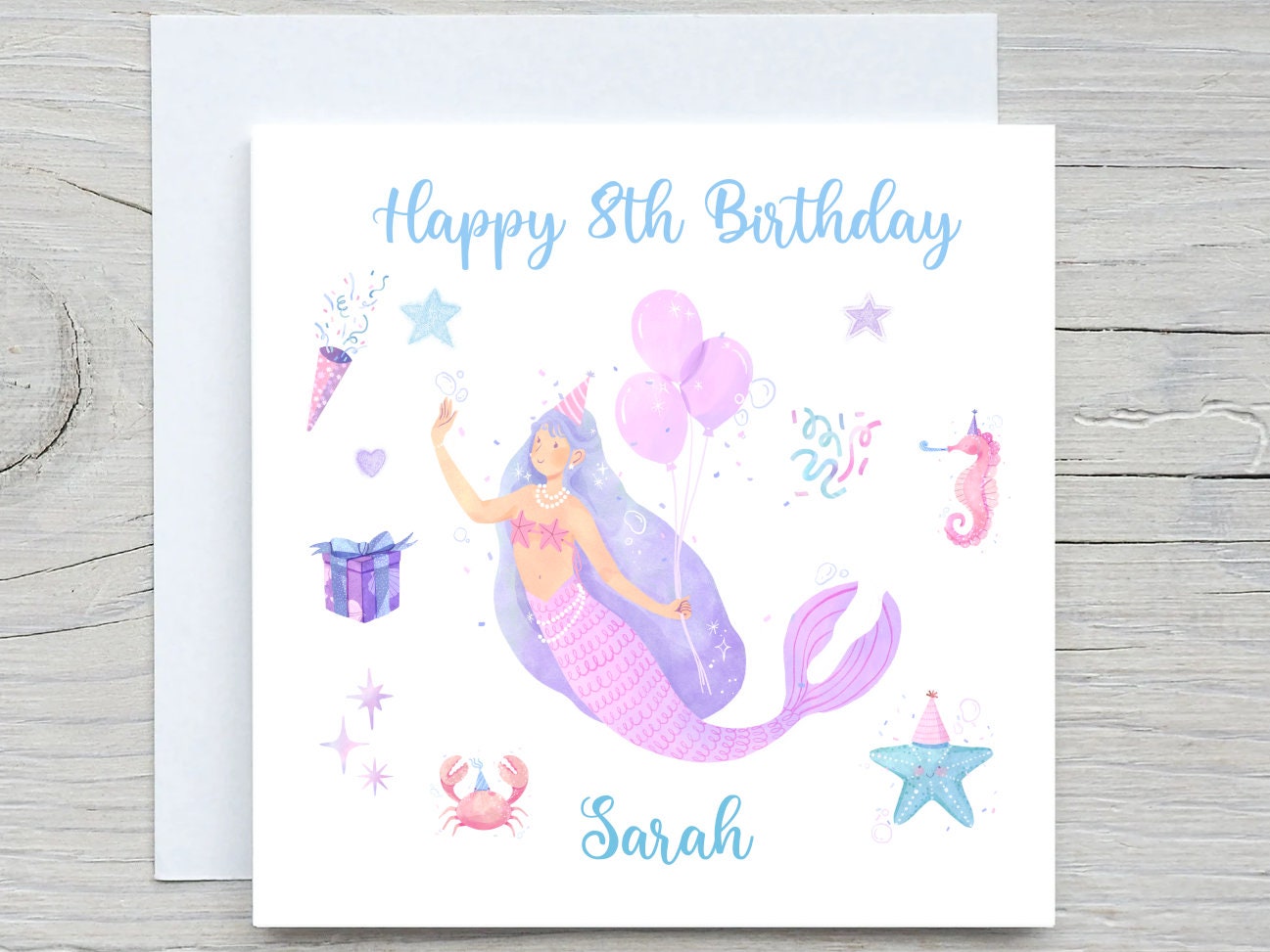 Personalised Birthday Card, Mermaid birthday card, watercolor birthday Cards, add name and age card, for daughter,