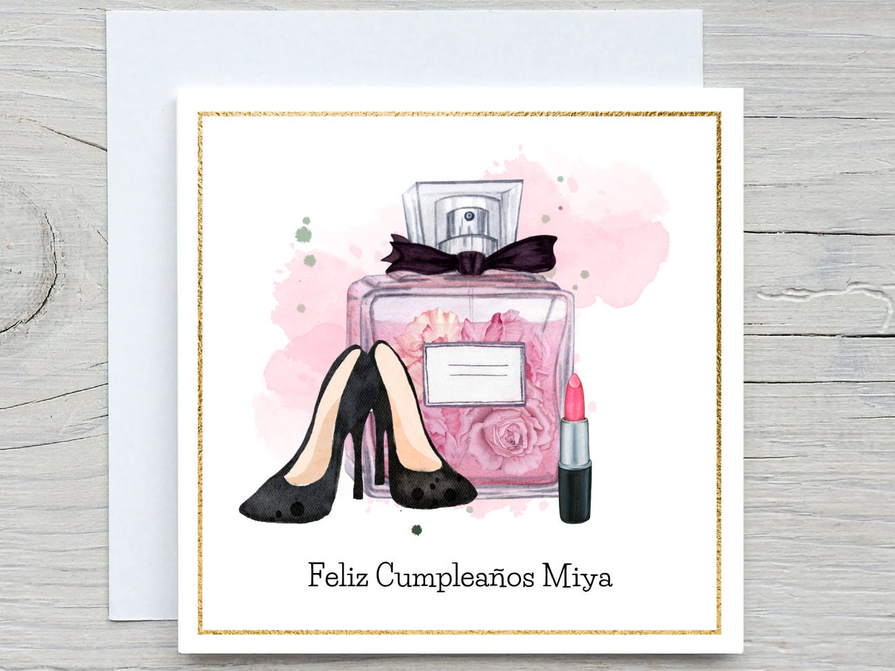 Spanish Personalised Name Birthday card, Perfume High heels birthday card, for her birthday card, diva fashion lover birthday, feliz cumple