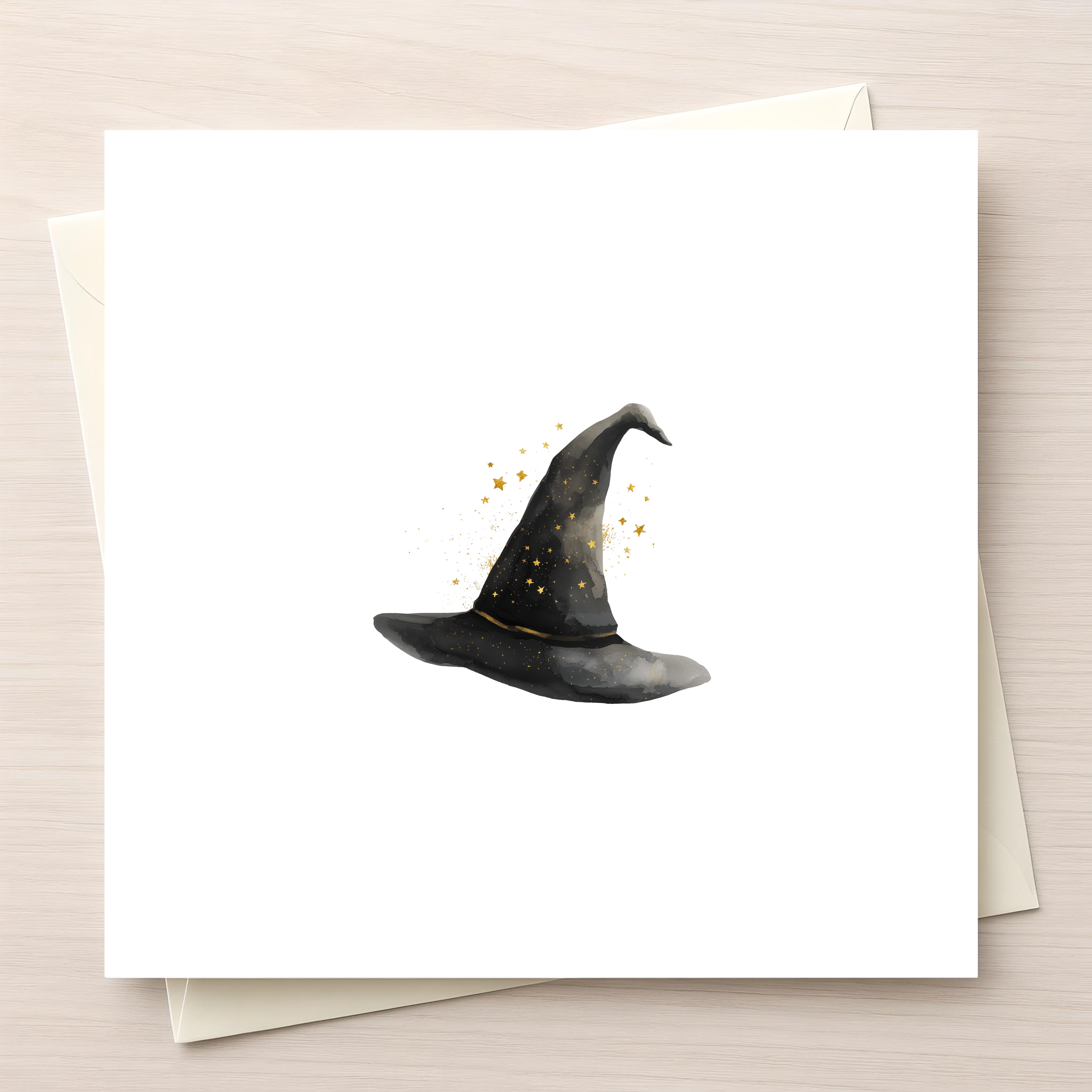 Minimalist Halloween Card – Watercolor Witch Hat with Floating Stars – Elegant Spooky Season Greeting