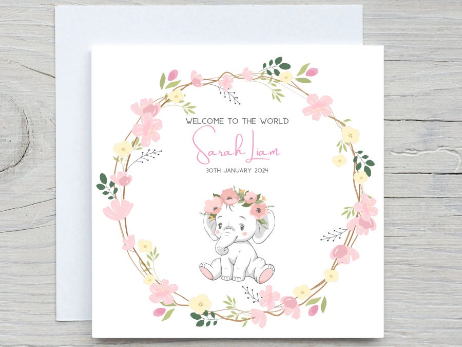 Personalised Baby girl Newborn Card , Baby Girl Elephant Birthday Card, Welcome to the world