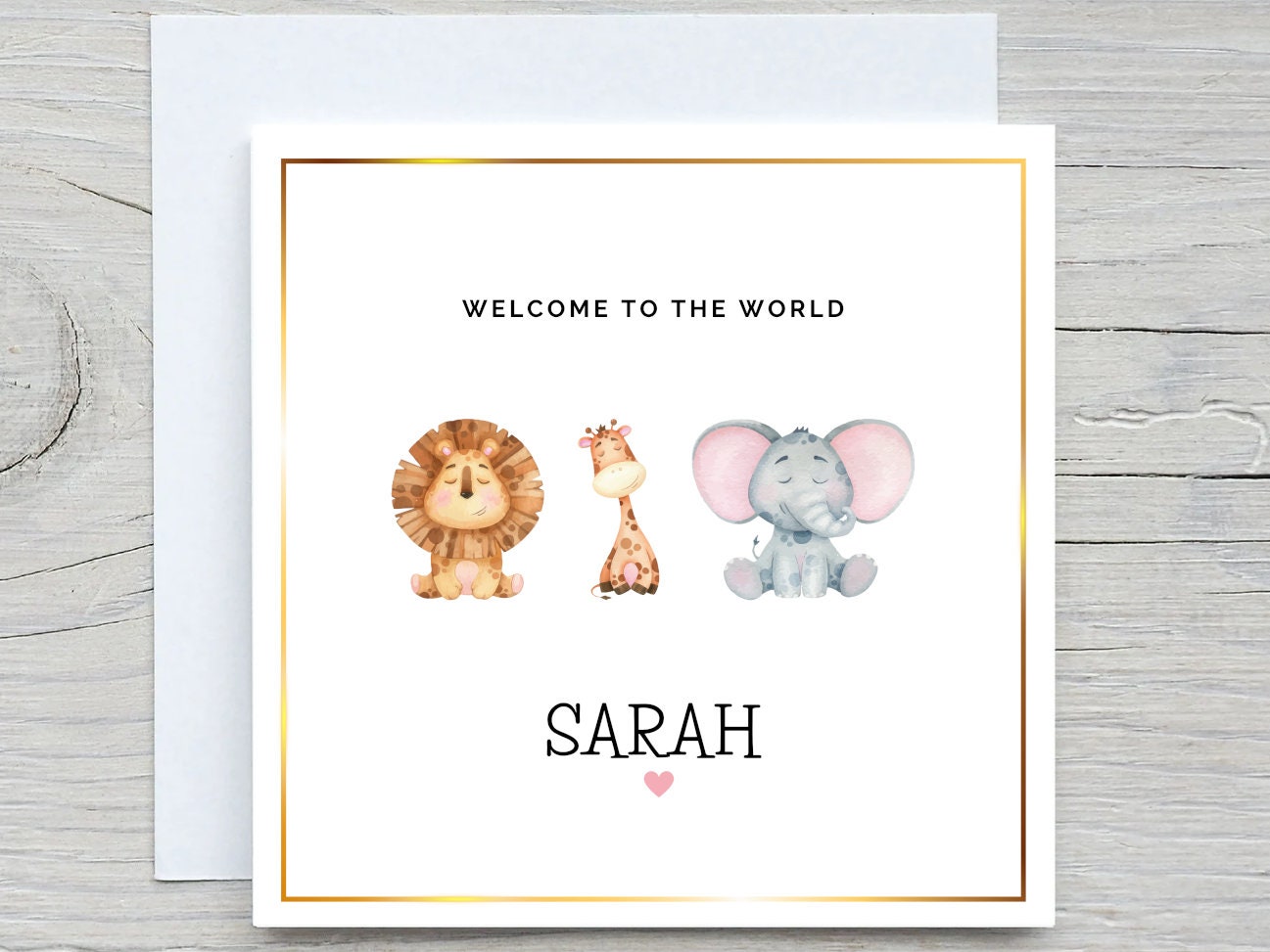 Personalised Welcome To The World New Baby Card, Cute Animals Baby Card, New Born Card