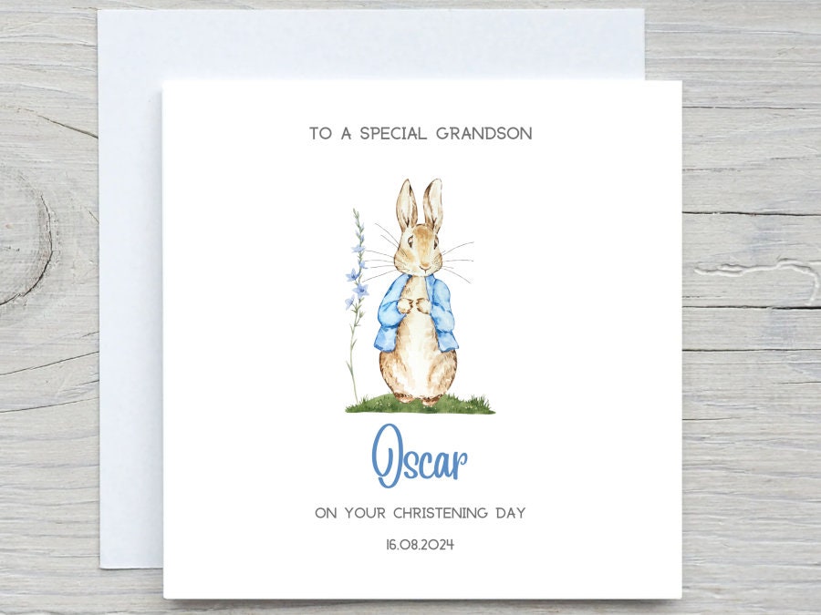 Personalised Christening Card, Baby Boy Blue Bunny Rabbit Card, Baptism Card, Baptism Card For Nephew, Grandson Baptism Card