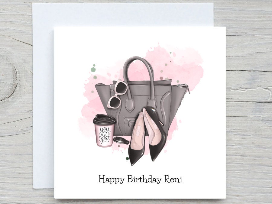 Personalised Name Birthday card, Bag Coffee Boss Girl High heels birthday card, for her birthday card, diva fashion lover birthday card