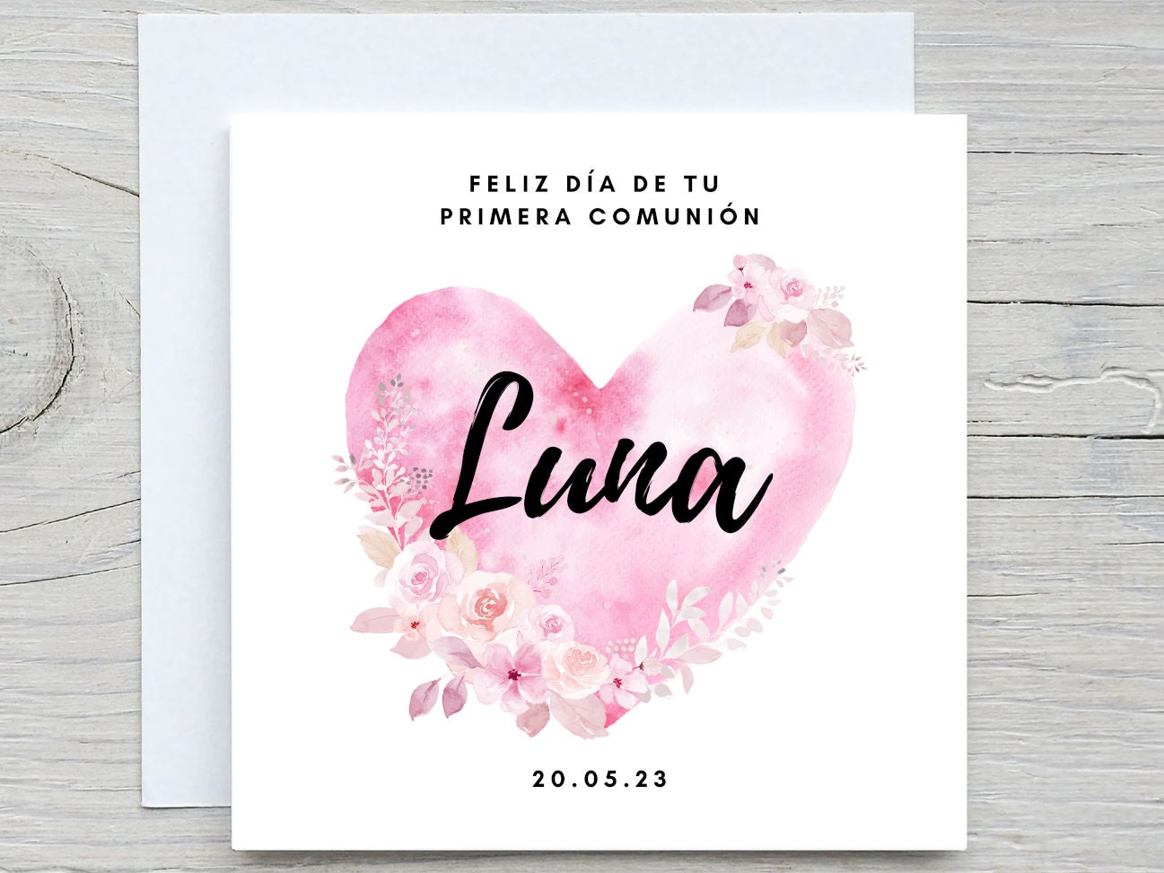 Spanish Communion Card , Personalised Card For daughter, Granddaughter, Niece , Watercolor Pink Heart Baptism Card, primera comunión